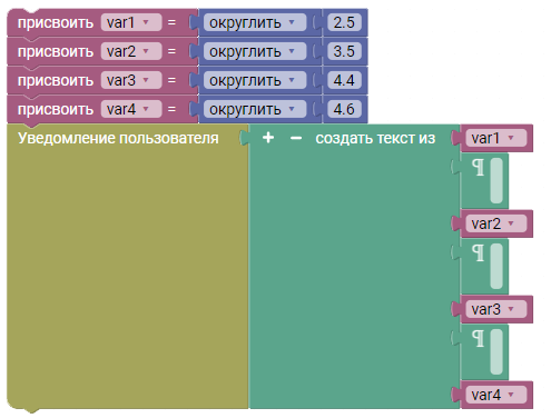 В данном примере показывается работа блока Округлить, который заменяет вещественное число на ближайшее целое.