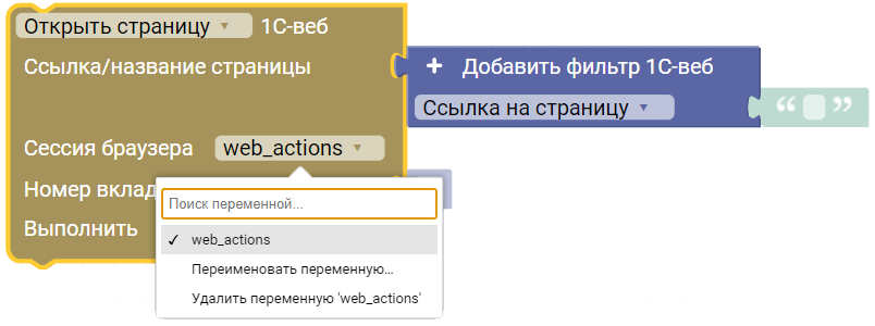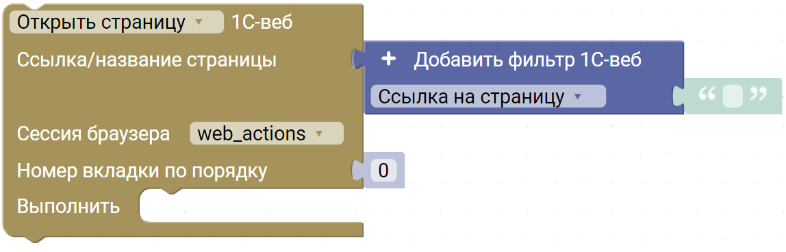 Блок позволяет открыть новую страницу в 1С-веб или переключиться на уже открытую. Для этого необходимо указать ссылку на страницу или ее название с помощью блока “Добавить фильтр 1С” или блока “Создать строку”.