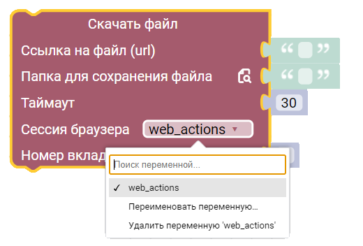 Блок скачивает файл по заданной ссылке из браузера и сохраняет его на компьютере по указанному пути.