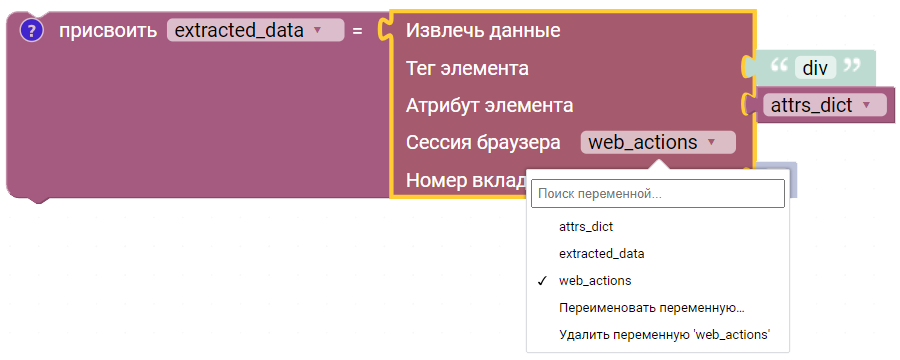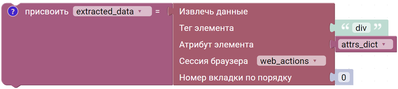 Блок осуществляет извлечение данных на странице браузера. Требуется указать извлекаемые атрибутов элемента.